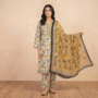 Elegant mustard and beige 3PC lawn suit with artistic prints and soft dupatta.